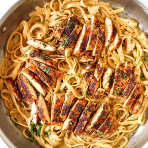Rigatone pasta, hongos, pimiento morron, salsa de queso parmesano, cajun...