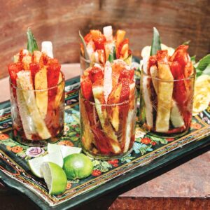 Telera frita en salsa de huajillo, chorizo, papas lechuga, queso, crema, salsa verde...